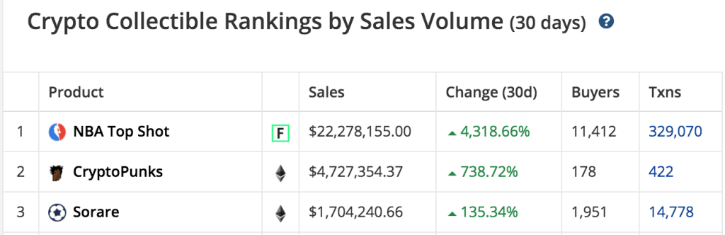 NBA Top Shot is easily the most popular crypto collectible in the world. Source: CryptoSlam!