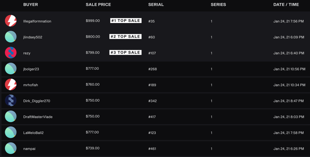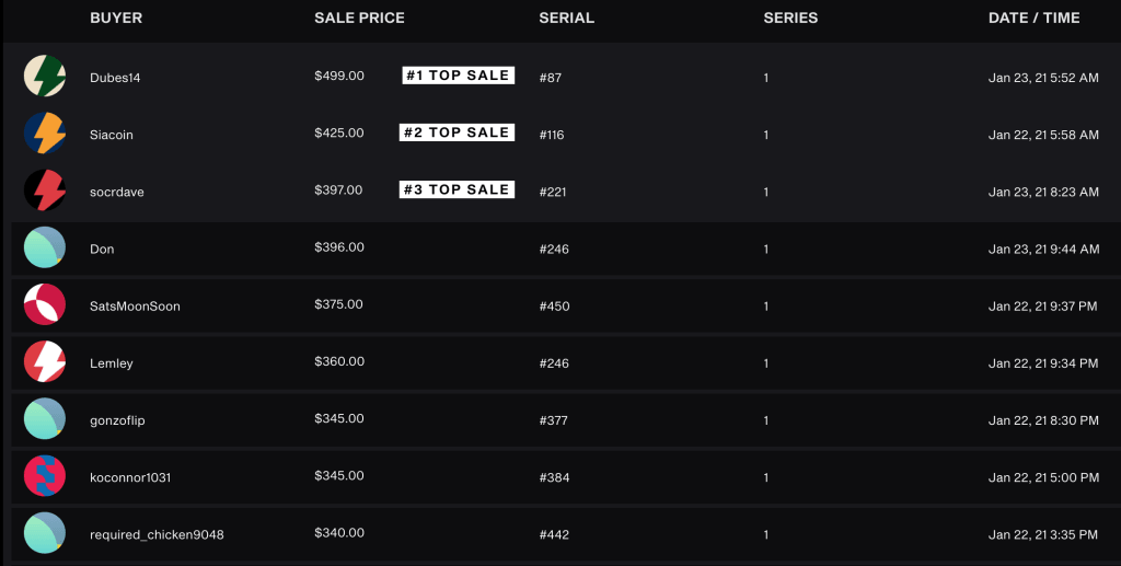 Turns out, I didn’t have to wait long to get an answer. NBA Top Shot gained SERIOUS momentum over the following month. While writing this blog post on January 23, I decided to check the most recent sales on the marketplace of other copies of my Giannis moment. Here’s a screenshot of the top three sales of all time, followed by the most recent sales on the marketplace: